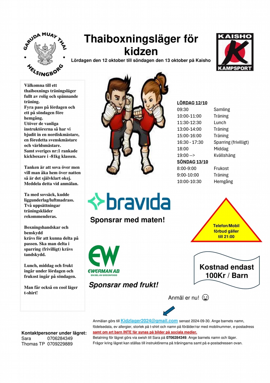 Välkomna till ett thaiboxnings träningsläger fullt av rolig och spännande träning lördagen den 12 oktober till söndagen den 13 oktober.Anmälan och betalning sker enligt infon i bilden.